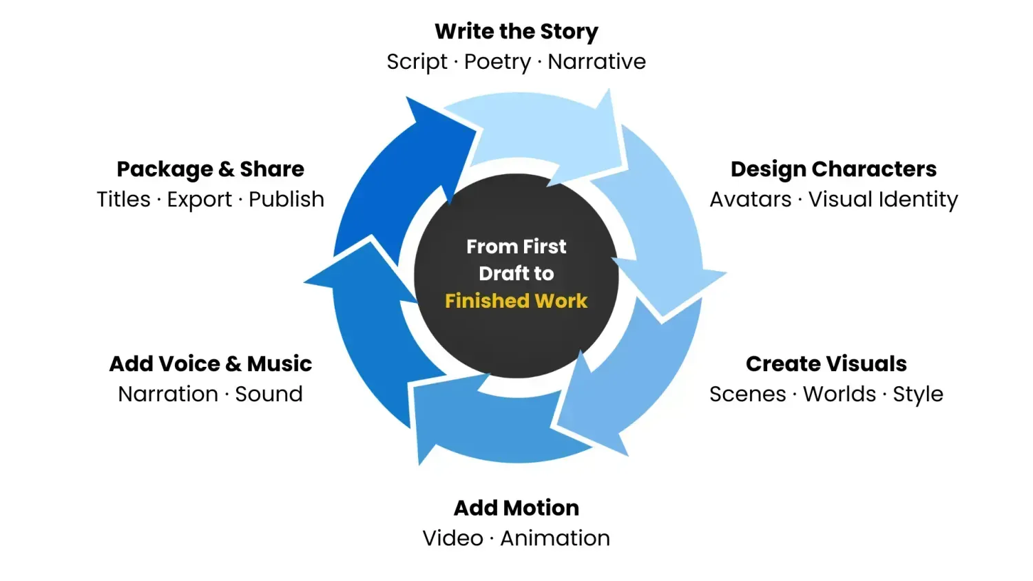 Each workflow is designed to support the full creative process — from early drafts through revision and completion — rather than single-step generation.